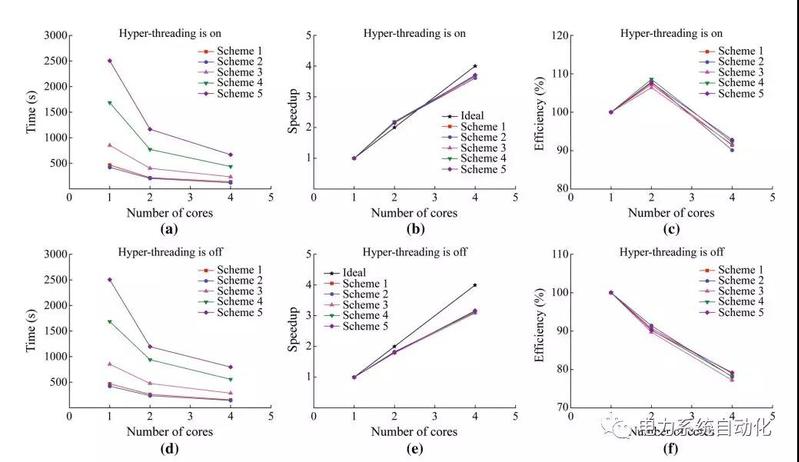 结果表明,无论是在配置1和2上,本文所提并行框架的并行效率都得到了验证。得出以下结论:a)分析时间主要与故障总数有关,与校核支路总数关系较小,大规模系统下校核支路即使成倍增加也不会造成耗时突增,有利于大范围批量扫描;b)随着内核数的增加,计算时间减少,加速比增加,效率降低;c)开启了“超线程”技术,具有更多的逻辑线程,能获得更好的并行效果;d)由于PSD-BPA软件涉及与测试机器硬盘的文件交互,在多线程同时读写文件大小达到一定程度时,硬盘的读写速度会影响计算效率。