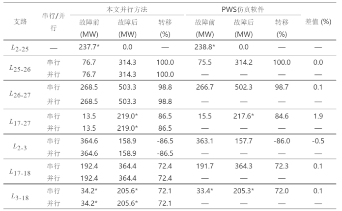 测试结果显示,并行与串行结果完全一致,并且所提方法计算结果与PWS软件计算结果同样一致,相差甚微,平均转移结果偏差为0.28%,验证了文中所提方法的可行性和准确性。以支路L2-25发生N-1开断故障为例,有功潮流转移分析结果如表2中所示。